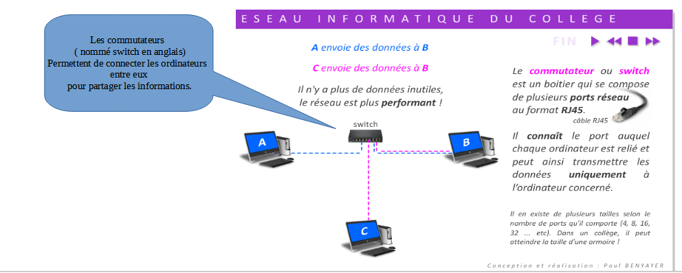 Afin de répondre à notre question, nous vous proposons d’imaginer une solution en représentant sur un schéma au format A3. Sur celui-ci seront identifiés les différents éléments du réseau informatique ainsi que les connexions entre les terminaux. Il ne faudra pas oublier de légender les différents éléments. Il est recommandé, dans un premier temps, de tracer les traits au crayon de papier afin de corriger si nécessaire.